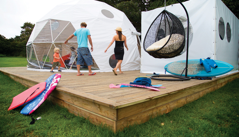 And if the outdoors needs to match a mood, the same applies no less to the indoors, hence the domes. For one thing, the sheer headroom is very untent-like: their sense of space is calming, the opposite of the cramped and cluttered stress a traditional tent can bring. There’s reassuring solidity, well-designed space for all, and the kind of covered kitchen and dining area that’s more about beautifully grilled food at a family-sized table than blackened meat and your own patch of damp grass to perch on.